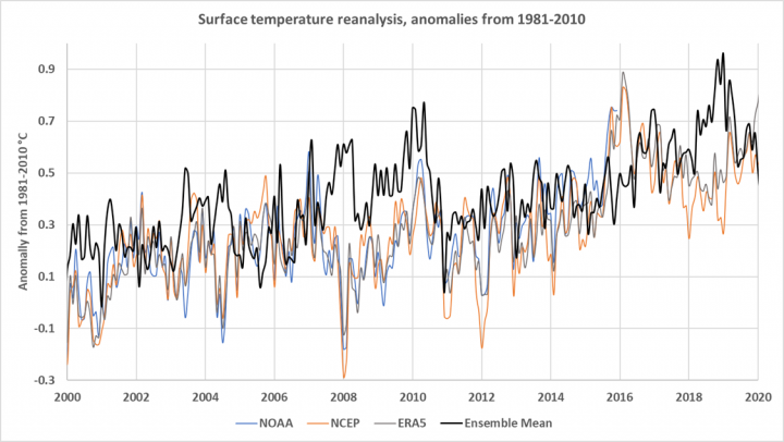 Figure 3 compares the same ensemble mean shown in Figure 2 to three weather reanalysis datasets, also downloaded from the KNMI Climate Explorer. The weather reanalysis datasets are shown in the fainter lines.