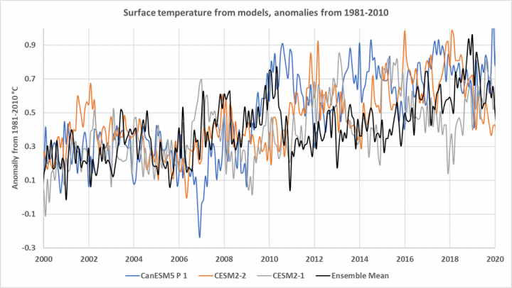 Figure 2. Three individual model runs are compared to the 13-member ensemble mean. The vertical axis is the anomaly from the 1981-2010 average in degrees C.