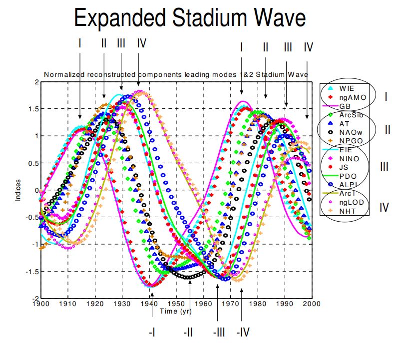 Wrong again, it is very evident when we compare the “climate wheel” in Wyatt and Curry’s post to Figure 3 or the longer figure above. The wheel is attached. The red numbers are approximate years for warm peaks and the blue numbers are cold peak years.