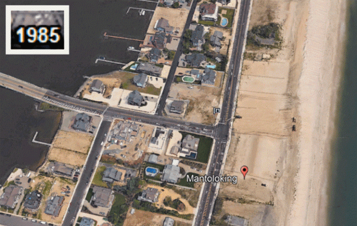 A couple of things to note from the slide show: Back in 1985, they were using bulldozers to build a protective dune between the sea and the main highway. By 2012, the entire strip between the highway and the dune had been filled with houses. Hurricane Sandy cut a new inlet from the Atlantic Ocean into the enclosed sound, but in the rebuilding it was filled back in with sand. In the present, there are four or five beach-front lots remaining empty. This view is current as seen from the north. Just north a bit more up the highway, less than a mile, the comparatively small house at 1007 Main Ave, right on the beach, was recently sold for $4,500,000.
