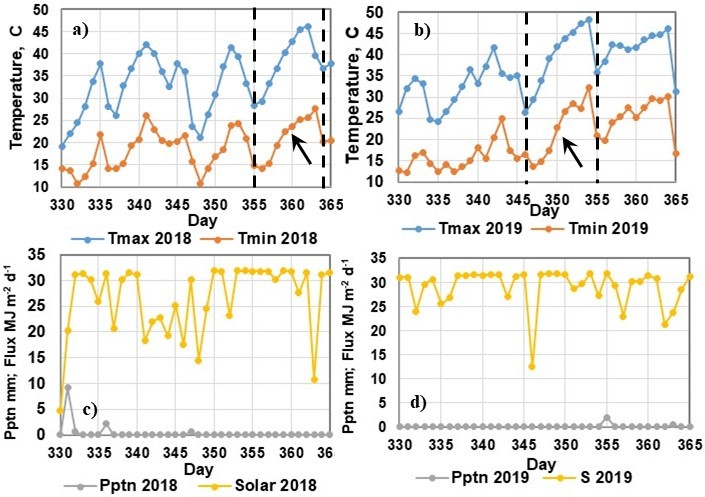 The figure shows the temperature record for Woomera, SA for December 2018 and 2019 [BOM, 2020]. The upper plots show the max and min temperatures and the lower plots show the rainfall and total daily solar insolation. There was an increase in temperature produced by a ‘blocking high’ in both years as indicated by the arrows in the temperature plots. For 2018 there was in increase in maximum surface temperature of almost 18 C over a period of 7 days. For 2019, there was an increase of almost 22 C over a period of 8 days. This was associated with record temperatures and major fires over a large region of Australia. There was also a record ‘spike’ in the Indian Ocean Dipole index [IOD, 2020]. The surface temperature of the Indian Ocean near Australia was below normal with reduced rainfall.