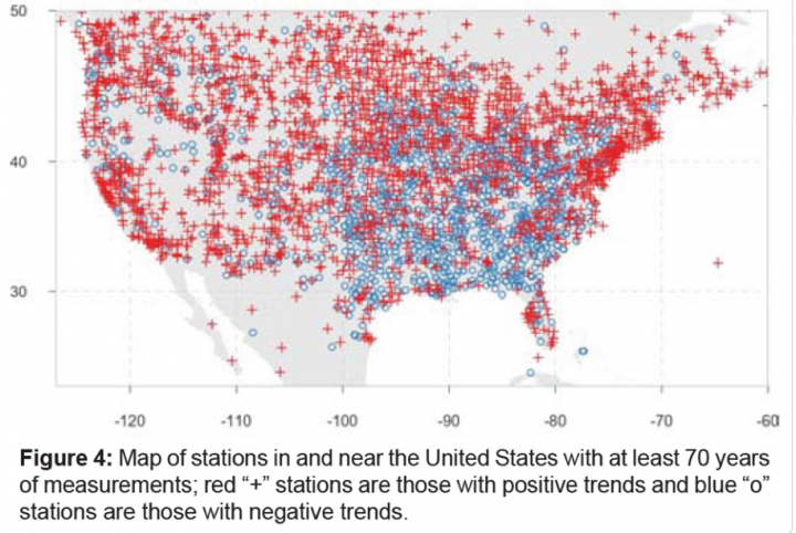 A different hypothesis is proving to be more robust. Instead of arguing a warming climate causes fewer cold snaps, climate dynamics flips cause and effect; fewer cold snaps will increase averaged regional temperatures. Climate scientists published, “Like many places, Canada is not warming, it is just getting less cold.” Indeed, while many maximum temperatures have decreased since the 1930s, the increase in average land temperatures has been due solely to higher minimum temperatures,. Appropriately, regions with rising average temperatures have experienced fewer cold snaps. In contrast, due to the dynamics of quasi‑stationary planetary waves, cold snaps remain common over other regions. In much of the southeastern USA, temperatures have failed to exhibit any warming trend in the past 70+ years, despite urban warming effects. Such regions are classified as warming holes because they fail to exhibit the warming trend predicted by rising CO2.