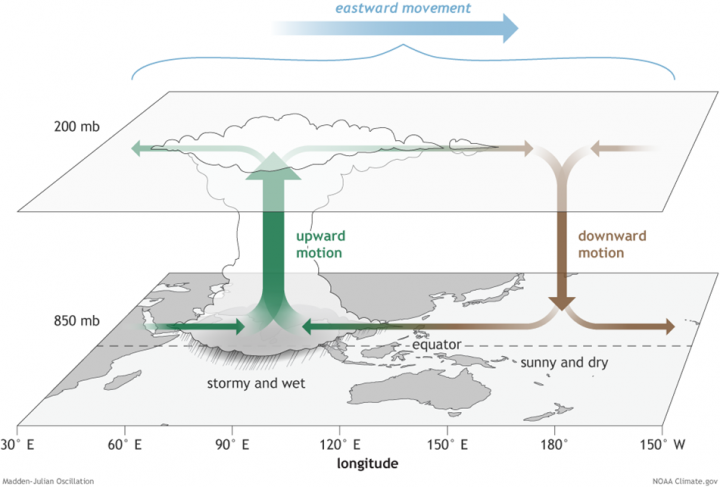 During a La Nina the pile‑up of warm waters in the western Pacific increases the largest body of warm water on earth, aka the Indo-Pacific Warm Pool. Convection increases over the warm pool and strengthens the Asian and Australian summer monsoons. Regions of rising convection also move across the Indian and Pacific Ocean alternating warmer and cooler patches of the oceans every 30 to 60 days (Madden‑Julian Oscillation). Pressure from the growing Pacific warm pool pushes heated water through channels between the Indonesian Islands and increases temperatures in the Indian Ocean. Warmed Indian Ocean water can leak around the southern tip of Africa and adds heat to the Atlantic. Simultaneously, the northward flow of warm water increases along the eastern Asian coast via the Kuroshio current, as well as pushing warm water southward along the Australian west coast via the Leeuwin Current. An especially strong La Nina amplified the warm Leeuwin Current causing a marine heatwave along the western Australian coast in 2011, with severe coral bleaching and devastation to marine fisheries.