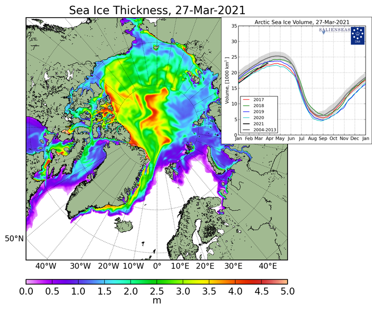 Shades of purple are one meter or less, and anything between one and two meters. By the time one gets to any shade with green, the ice is over two meters thick up to three meters. Shades of yellow are three meters to four meters.