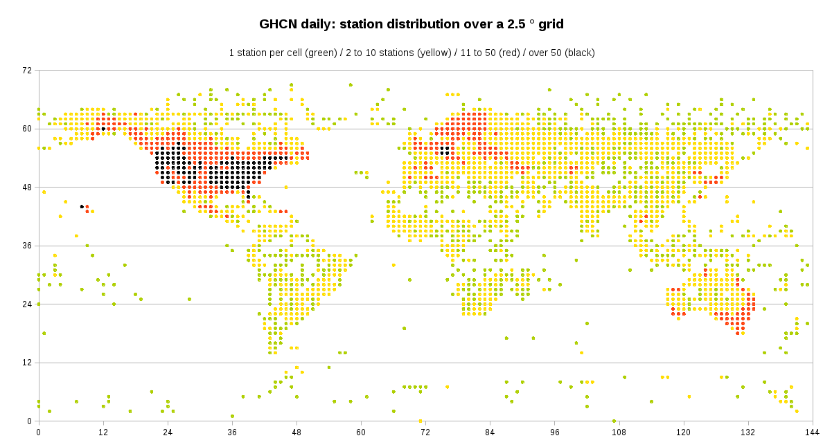 I forgot a last detail in the previous comment: a graph showing the temporal average of the GHCN daily station distribution over a 2.5 degree grid: