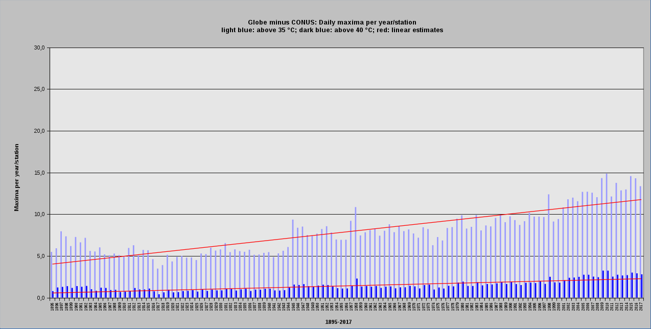 As somebody asked on the blog for a worldwide extension, I first made a graph very similar to Prof. Christy’s, this time out of a considerably higher number of CONUS stations (over 18,000) present within the GHCN daily station set.