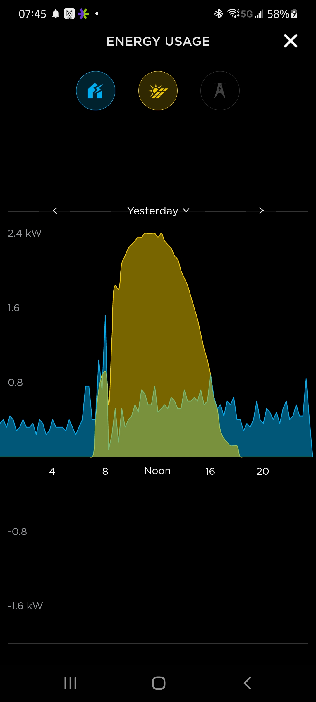 The problem is that fixed rooftop systems are not perpendicular to the sun’s rays and therefore will never produce their nameplate power. The graph shows the production yesterday in yellow and the consumption in blue (or green). The solar production exceeded 50% of capacity for about 4 hours yesterday. To use solar power to run a factory you would only have production operating between 0800 and 1600 in the Summer, and much shorter hours in the Winter. Cloudy days would not have much production at all.