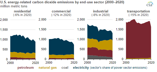 “CO2 emissions associated with energy use fell by 12% in the commercial sector in 2020. Part of this drop in emissions was due to pandemic restrictions. Because electricity is a large source of energy for the commercial sector, the declining carbon intensity of electric power also contributed to declining CO2 emissions from commercial activity. Emissions from commercial electricity use fell by 13%. Commercial petroleum and natural gas emissions fell by 13% and 11%, respectively.”