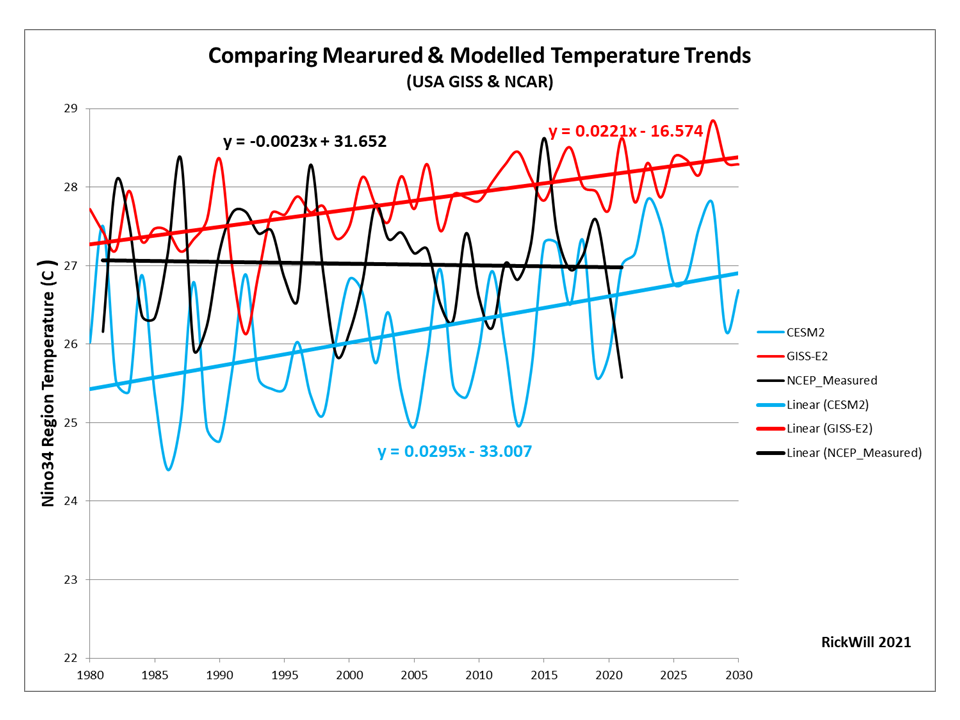 The attached chart shows the absurdity of models – showing a warming trend where there can be none. The UK groups have cooled the past to the point that there could have never been the 1998 El Nino – the region was simply too cold in the model world.