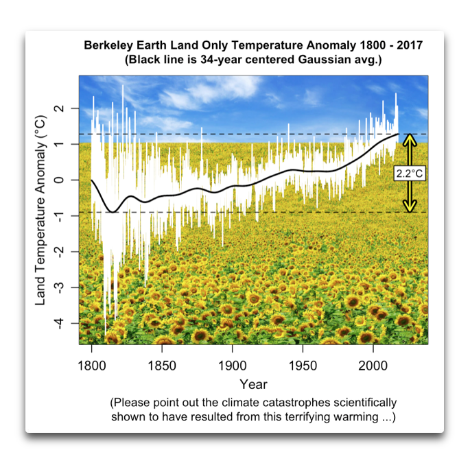 Land temperatures have already risen more than the dreaded 2°C, with no cataclysmic consequences … so no historical “climate emergency” despite temperature increases.