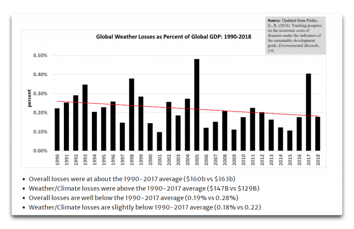 Global weather disaster losses as a percentage of assets at risk (global GDP) are decreasing, not increasing.