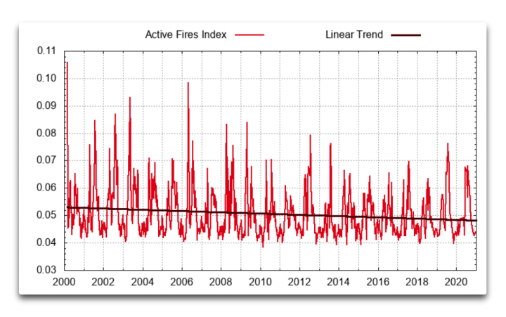 There has been no global increase in the number of wildfires … here’s the NASA satellite data.