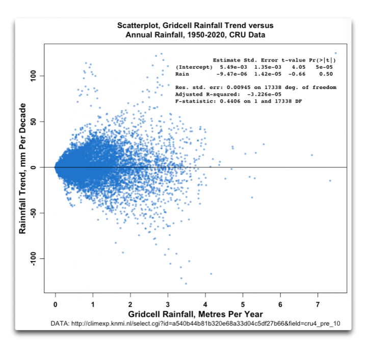 Even the IPCC says there’s only one chance in five (“low confidence”) that global droughts are increasing. Nor have the “wet areas been getting wetter and the dry areas getting drier”. No flood or drought emergency.