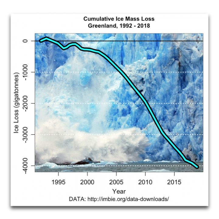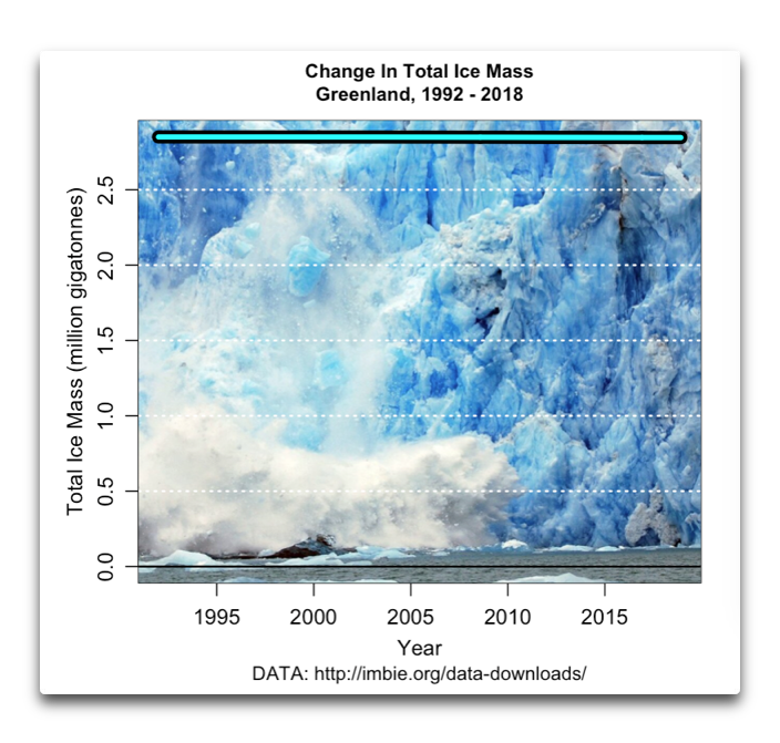 Those look totally frightening and emergency-like … until you realize that they ignore the reality of just how much ice there is in those locations. Here are the corresponding changes in total ice mass for the two locations.