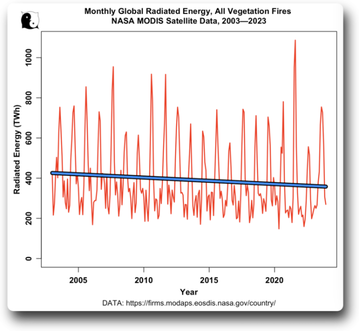 There has been no global increase in the radiated energy of wildfires … here’s the NASA satellite data.