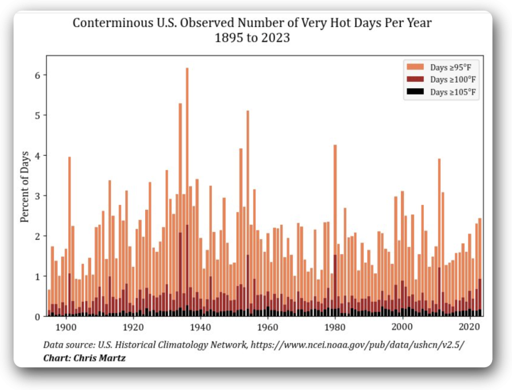 Regarding heat, very hot days in the US (over 100°F, or 38°C) were much higher in the 1930s than at any other time in the last 125 years.