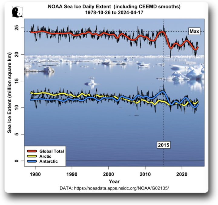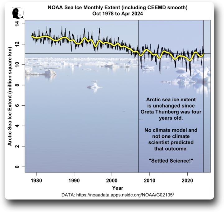 Here’s a long-term look at global sea ice. Curiously, there was little change until about 2015, when it dropped and then leveled off. Not one climate model and not one scientist predicted that.