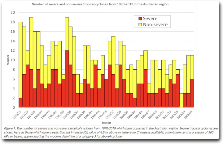Finally, here are the declining numbers of both strong and average cyclones (Southern Hemisphere hurricanes) in Australian waters, from the Australian Bureau of Meteorology (BOM).