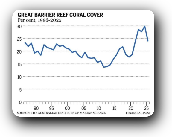 And the Great Barrier Reef, which has been claimed over and over to be a victim of coral bleaching, actually has more coral cover than at any time since records have been kept in 1985.
