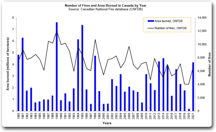 Here’s the data from Canada … the number of fires and the area burned are both decreasing.