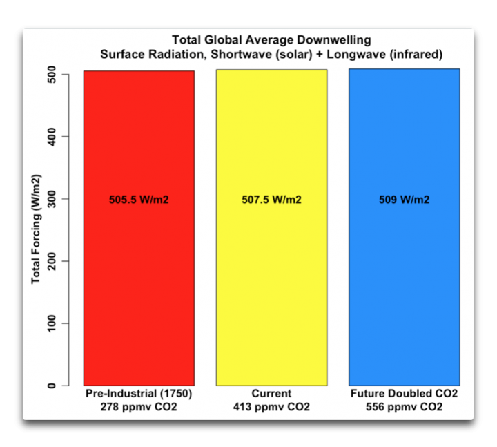 The changes in downwelling radiation from the increase in CO2 are trivially small, lost in the noise …