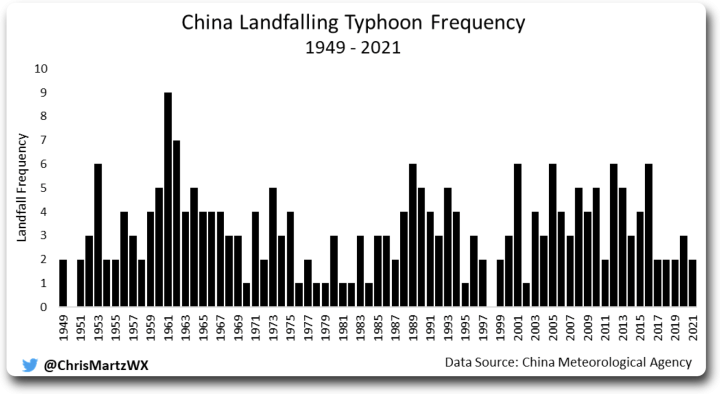 Here are landfalling typhoons (hurricanes) in China. Like the majority of the world areas, we’re seeing fewer landfalls in China.