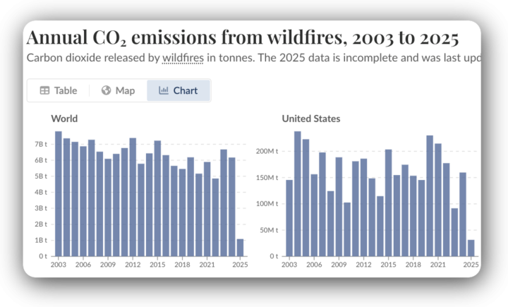 There’s another way to measure wildfires, by the amount of CO2 emitted from fires globally. Again, the trend is downward. SOURCE