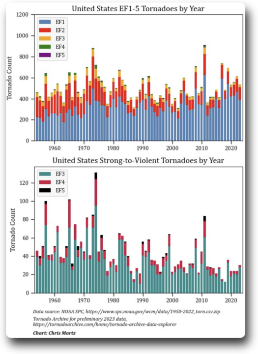 Strong tornadoes in the US are steadily decreasing over the last 72 years.
