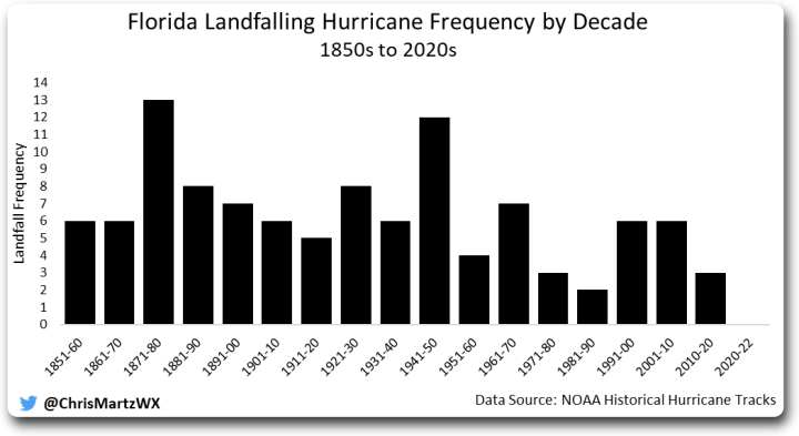 And here are a century and a half of records of the number of landfalling hurricanes in Florida.
