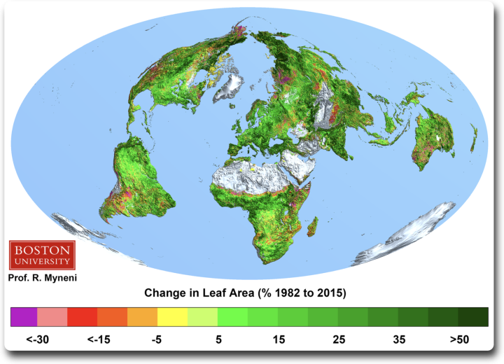 Meanwhile, increasing CO2 is causing increased plant growth all around the globe, which is increasing the food supplies of humans and animals alike. Here’s the data from NASA.