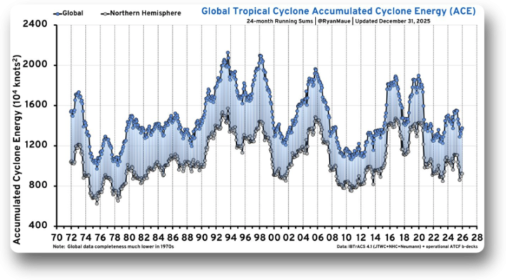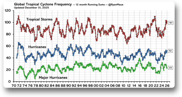 And here is the global hurricane frequency for all hurricanes, the strongest hurricanes, and tropical storms.