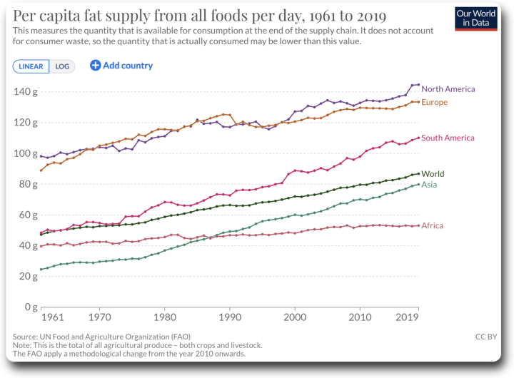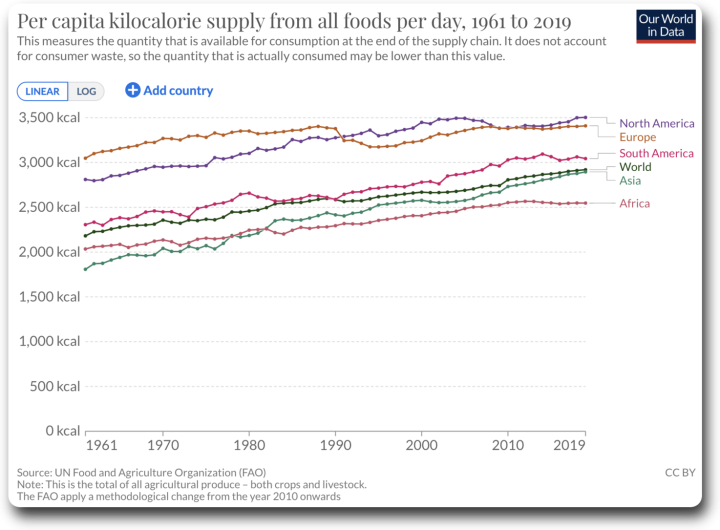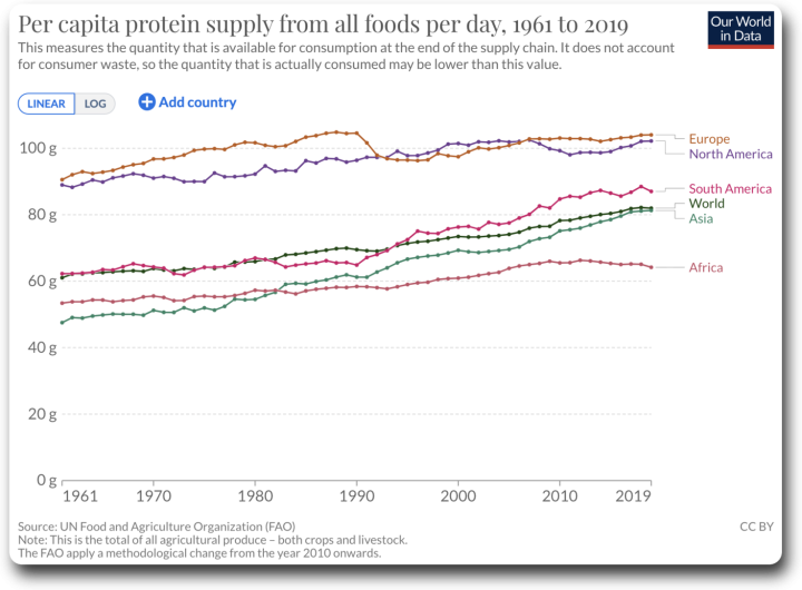 Note that on all three charts above (protein, calories, and fats), the world as a whole is now doing almost as well as North America did in my childhood in the 1950s … telling us that no, warming temperatures aren’t causing food shortages.