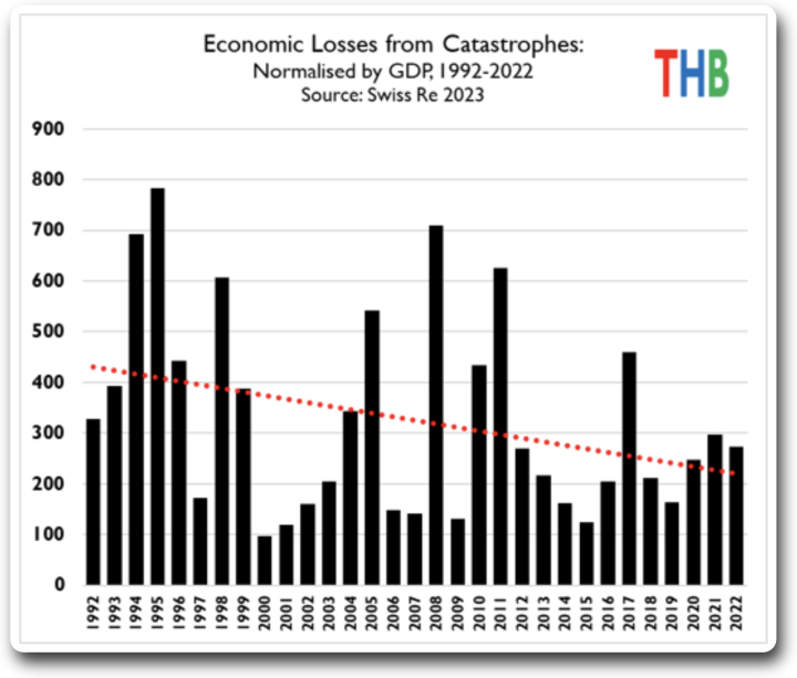 Global weather disaster losses as a percentage of assets at risk (global GDP) are decreasing, not increasing.