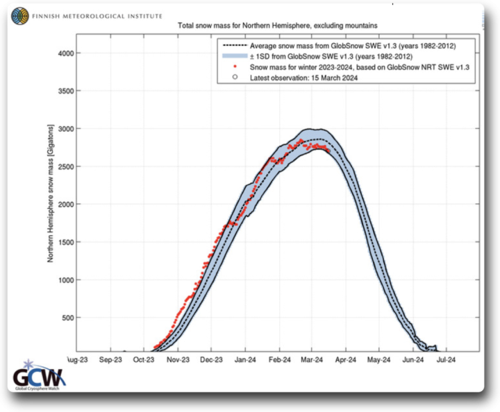 Let’s move on to snow. Remember all the hysteria about how “our children just won’t know what snow is”? Turns out the rumors of the death of snow are greatly exaggerated. Here’s the 2023-2024 snow record to date … it’s within one standard deviation of the mean, not unusual in the slightest.