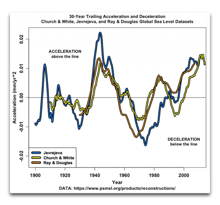 Tide gauges show no acceleration in the rate of sea-level rise, merely the up-and-down that’s been going on for a century and more …