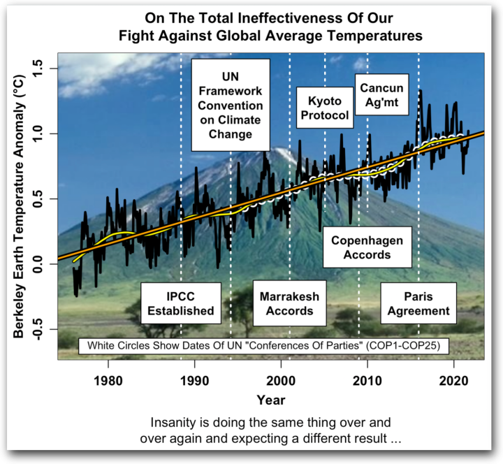 So if we wish to keep insulating people from the age-old destructive effects of weather, we need to maintain and increase the amount of cheap energy available, especially to the poor. If you insist on fighting the imaginary climate menace, at least have the kindness and the human decency not to do it on the backs of the poor by increasing energy costs, whether by “carbon taxes” or in any other way. I discuss this most important issue in my post “We Have Met The 1%, And He Is Us.”