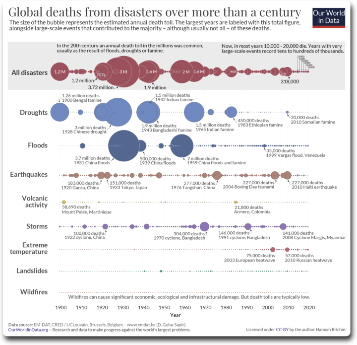 And it’s no surprise that the IPCC doesn’t think there’s an emergency. To start with, deaths from climate-related phenomena are at an all-time low. If you think deaths from climate-related catastrophes are an emergency, please point in the graph below to the start of the “emergency”.