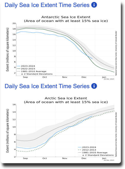 What about the widely-hyped reduction in sea ice? Turns out that as of the end of 2023, we’re back where we started. After a period of low sea ice, both Arctic and Antarctic sea ice are within the historical range.