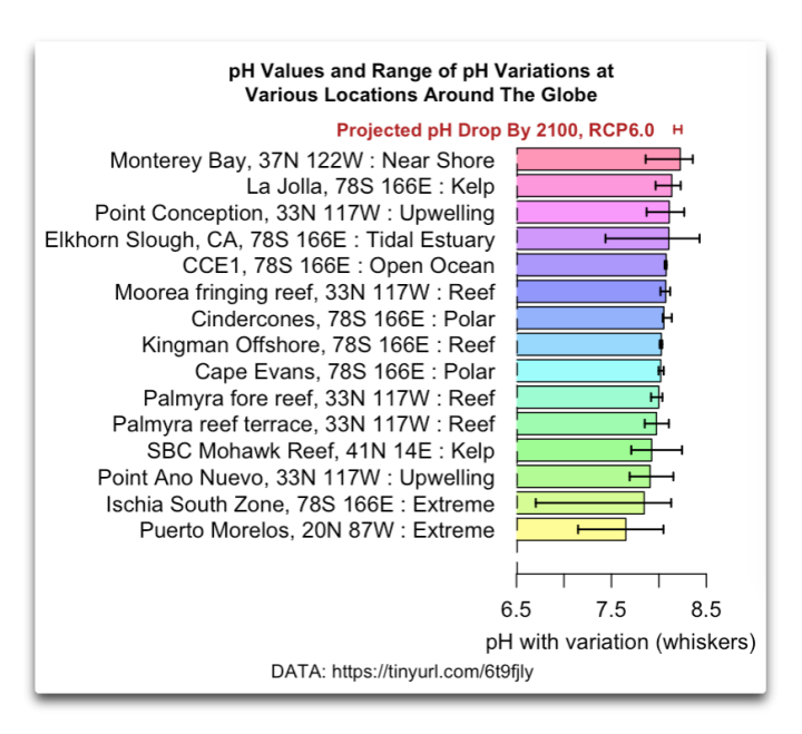 The “whiskers” (horizontal black lines with vertical lines at the end) show the variations in pH in each location. At the top of the graph, you can see whiskers showing the tiny projected drop in pH by the year 2100. Many ocean locations change that much in weeks or months. Bottom line? The projected change by 2100 is lost in the noise. A more detailed discussion of the pH issue is here.