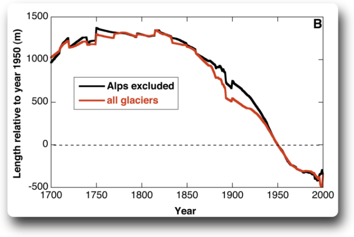 What about glaciers? Aren’t they shrinking? Well, yes … but they have been doing so since the depth of the Little Ice Age around the year 1750. And that means the first 150 years of shrinkage can’t be from CO2. Here’s the data regarding glacier length, from Oerlemans 2005
