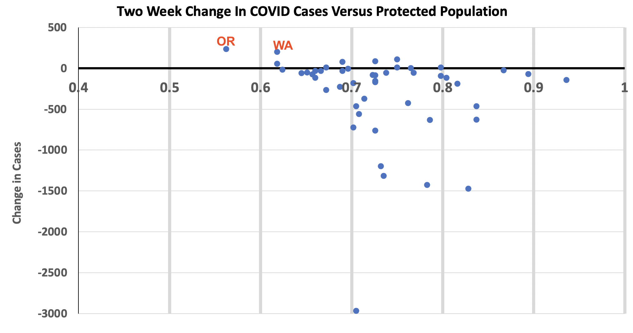The two states with the largest INCREASE in COVID cases for that period are Oregon and Washington!  And we are the states with the smallest percentage of immune individuals.