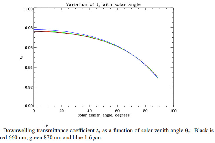 In your response to Shaffer, your points about confounding conditions are basically correct. However, the apparent roughness decreases as the angle of incidence increases, the wavelength impacts decrease with increasing angle of incidence, and the importance of suspended particles decrease as less light is refracted into the water. These effects are all substantiated by the graph you supplied that shows that all the lines of ‘t-sub d’ converge at about 60 deg zenith angle. That means that a simple Bond albedo misses the geometric effects as sunlight approaches the terminator.