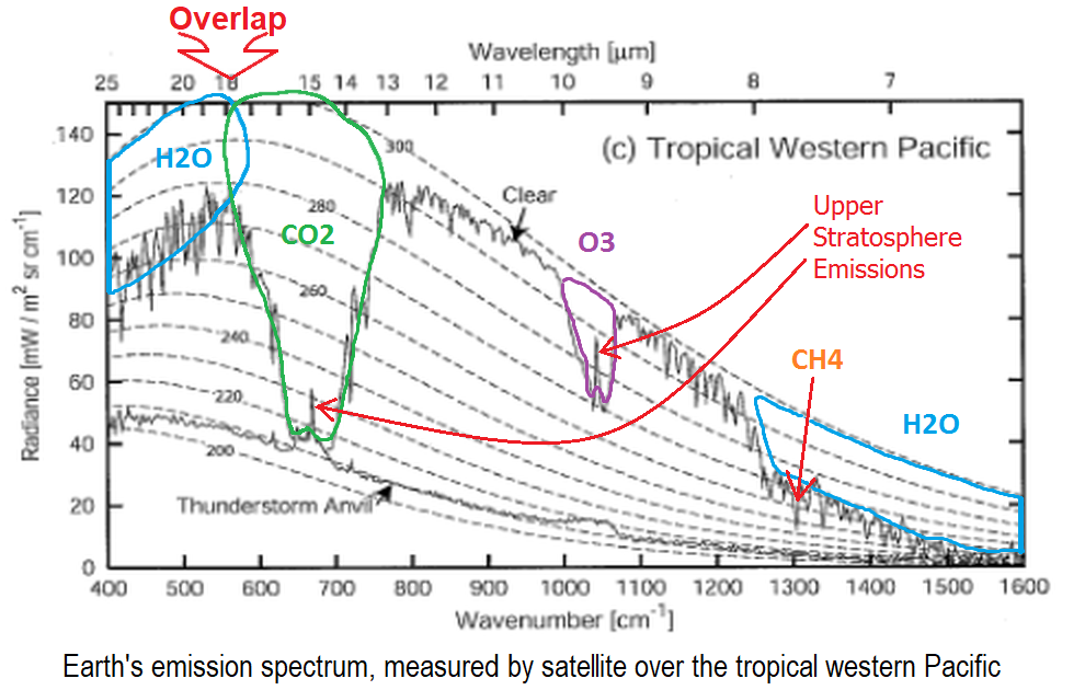 Kiehl and Trenberth (Table 2) say 390 W/m² is emitted by the surface and 235 W/m² (or 60% as much) is emitted at TOA into space, which implies an absorption by the atmosphere of at least 40%. K&T show a figure somewhat like yours (their Fig. 1), but the black-body radiation curve for the (global average) surface temperature shows a larger gap from measurements than what appears in the (Tropical Western Pacific) figure you’ve offered. I find it hard to explain the apparent difference in your chart and theirs. How could a smaller surface LW radiation be absorbed in the tropics than would be absorbed overall. Maybe some difference in assumed emissivity is in play?
