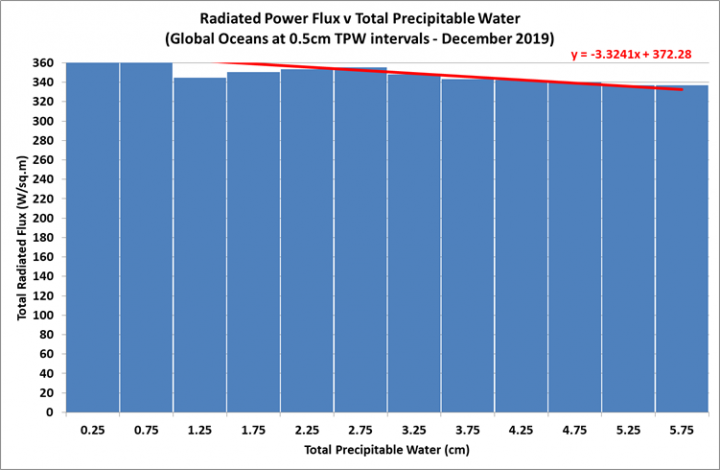 Figure 14: Radiated power flux above ocean surface as a function of atmospheric water content – December 2019.