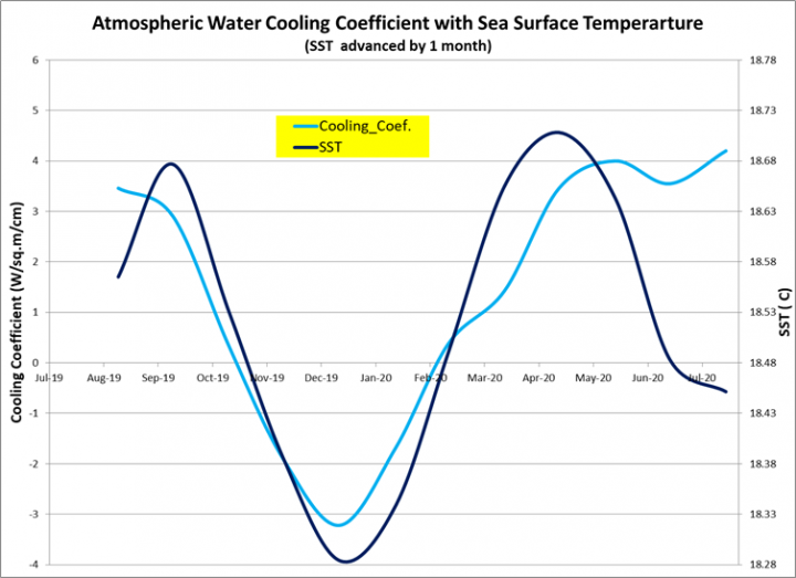 Figure 16: Atmospheric Water Cooling Coefficient charted with average Ocean Surface Temperature over twelve months – August 2019 to July 2020 for AWCC and July 2019 to June 2020 for SST advanced 1 month