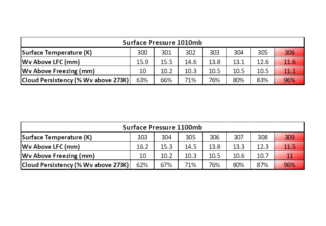 The upper limit a bit more challenging but just as precise as sea ice forming. Only it is atmospheric ice that forms above the level of free convection for the upper limit. Easy to demonstrate that the open ocean surface temperature CANNOT exceed 305K while the surface pressure sits around 1010mb. It is the simple atmospheric physics that climate models try to parameterise with the inevitable outcome being the huge blind spot. The 210W/sq.m powered heat engine that regularly catapults massive amounts of water above the LFC to as high as 14km.