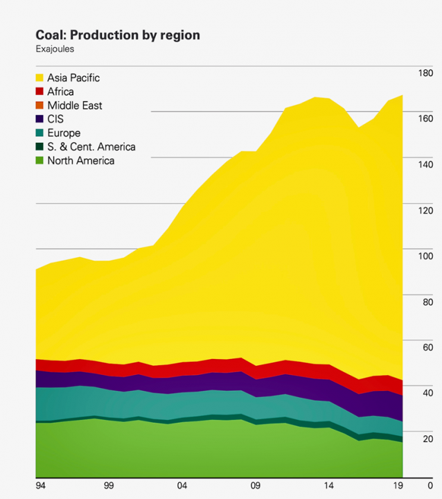 China’s uses staggering amounts of coal fuel as a part of the Asia/Pacific region of the world as shown in the graph below with China accounting for about 67% of that regions total coal fuel use. The Asia/Pacific region dominates use of coal fuel and consumes over 77% of all global coal use.