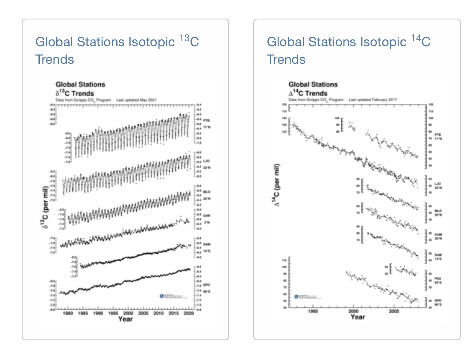 Scripps does report isotopes associated with CO2. C14 is slowly declining over time and C13 is increasing.