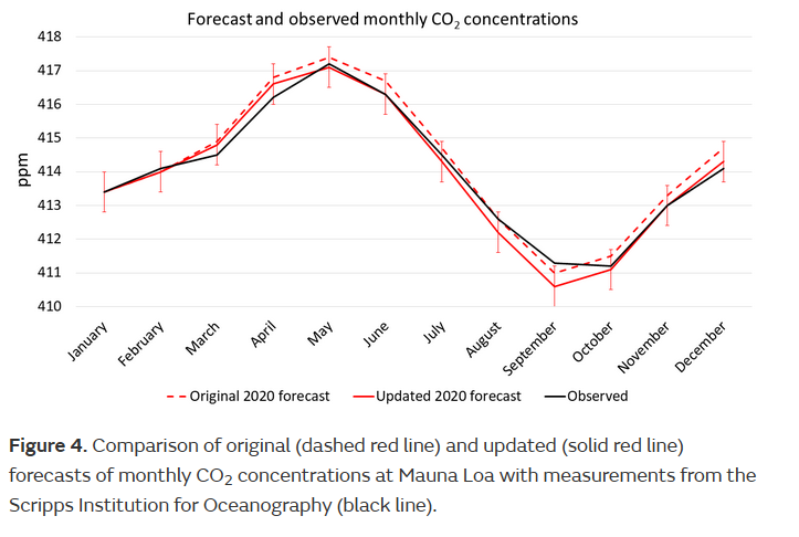 Therefore, that would predict a decline in the slope of the CO2 concentrations for the 2019–2020 ramp-up phase of about 9% in April (It increased!), or a lowered April 2020 concentration of at least 0.1 PPMv because of reduced CO2 emissions. It increased compared to 2019 and 2021!