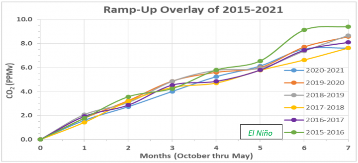 The wrinkles in the faces of older men are sometimes said to add character. One might similarly say that the CO2 ramp-up curves express more character than the drawdown curves. I think that the transient deviations from a linear growth tells us that something other than the usually constant anthropogenic emissions are having an obvious impact on the yearly growth. Figure 3, below, compares the last 6 years of the ramp-up phase. The El Niño event stands out; however, the other years – except 2017–2018 – are very similar.
